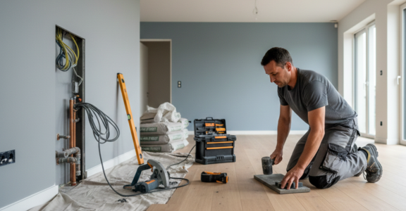 Travaux de rénovation tous corps d’état : électricité, plomberie, peinture, sols et isolation.